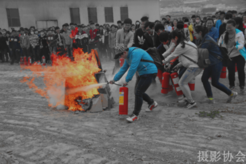 地震、火灾应急疏散演练后,在北校区体育馆北侧的空地上,又开展了灭火演练活动。首先,由专业指导人员向全体学生示范了如何正确使用灭火器、如何正确灭火以及相关注意事项。然后,工作人员将学生分为十个小组,指导学生依次进行灭火实战演练。