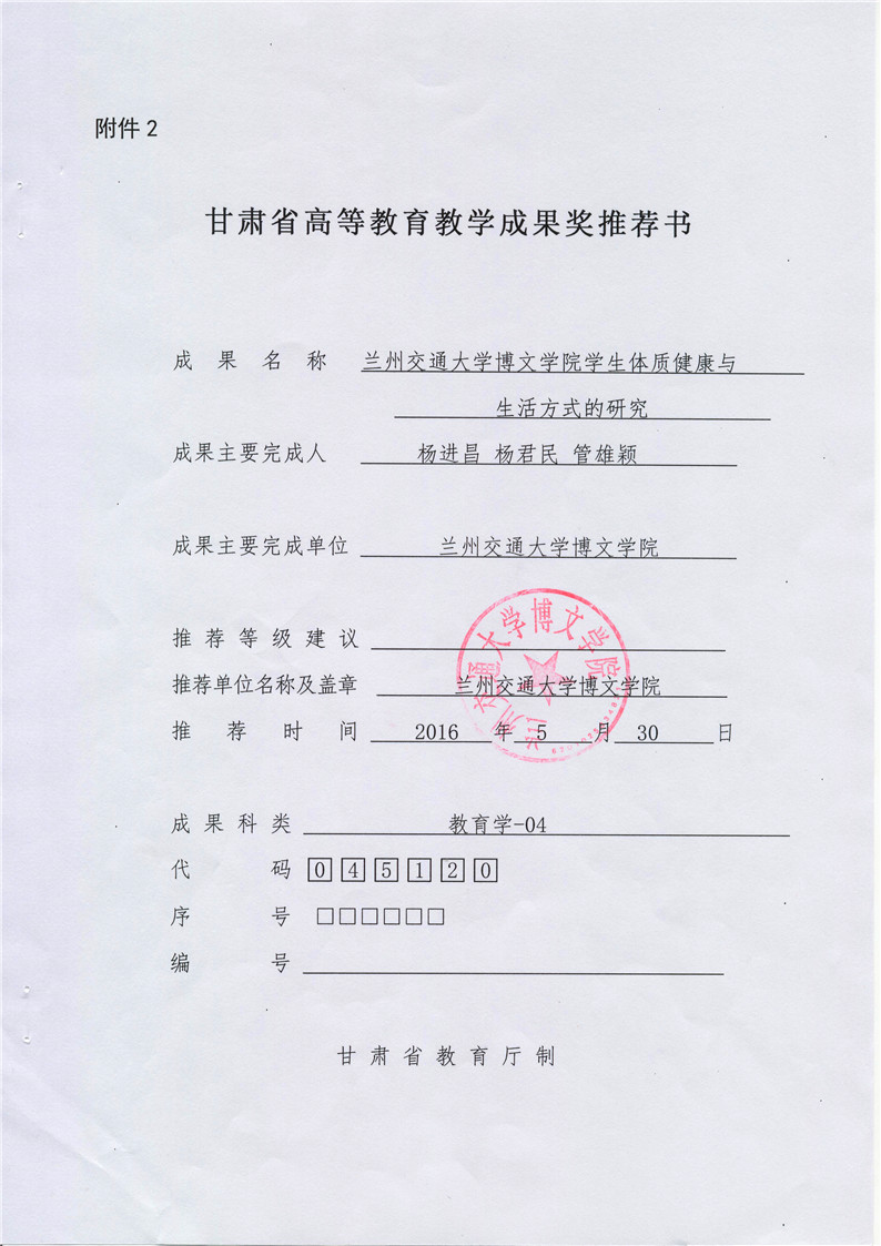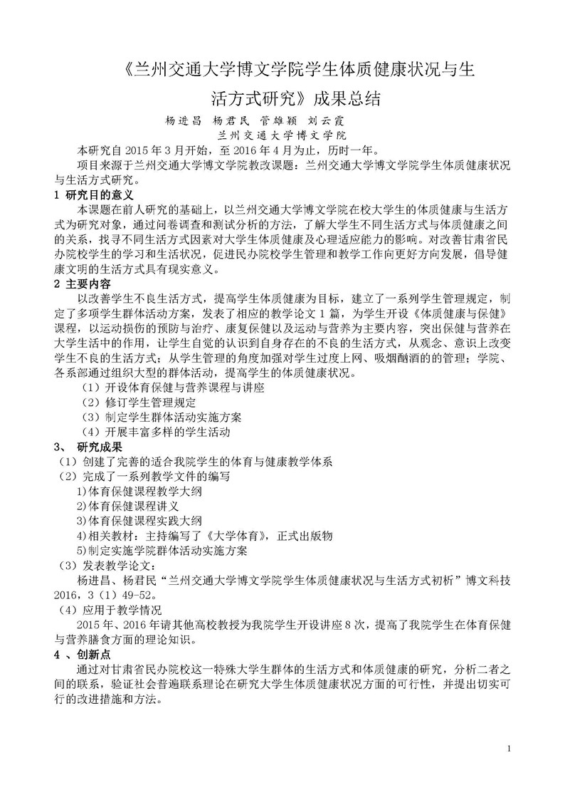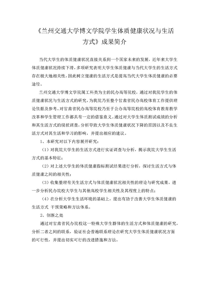 《兰州交通大学博文学院学生体质健康与生活方式的研究》成果推荐材料(2016年6月申报)