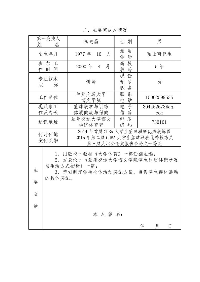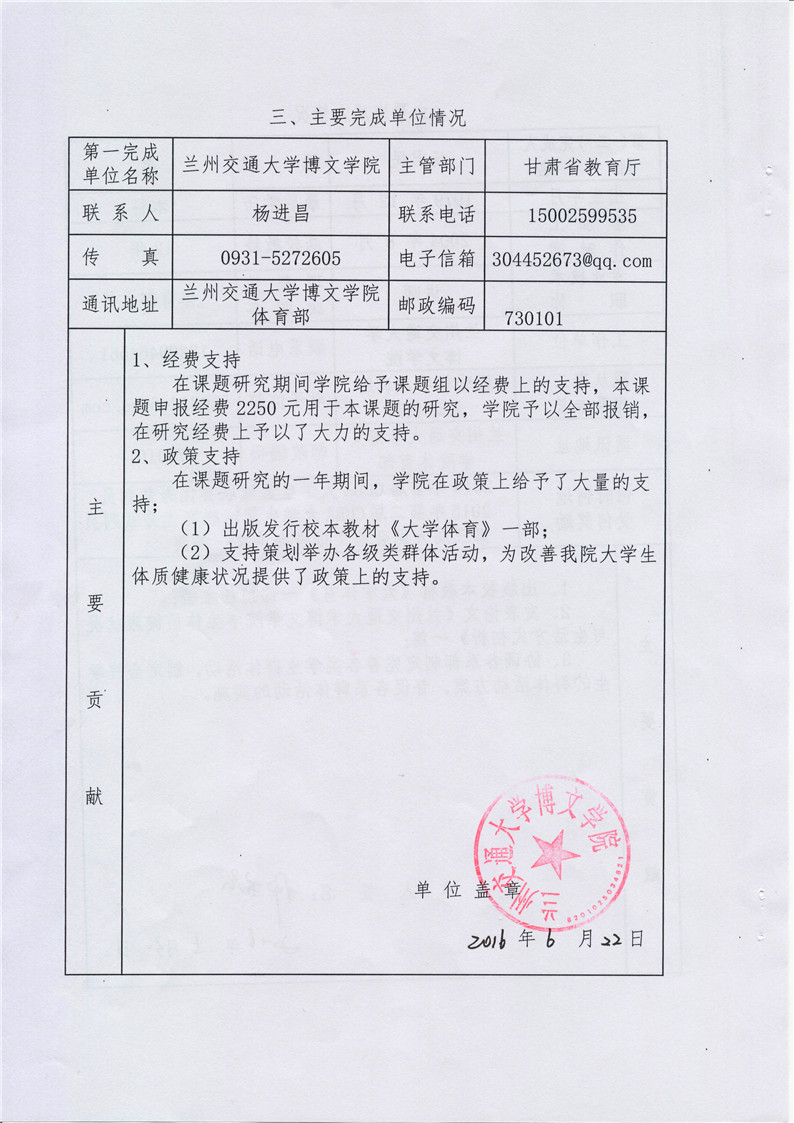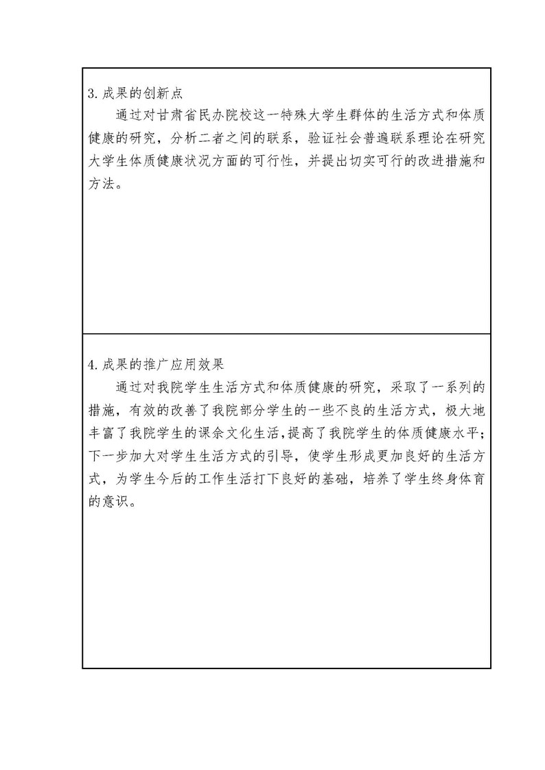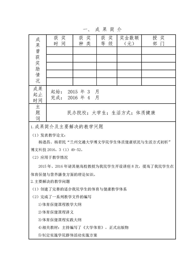 《兰州交通大学博文学院学生体质健康与生活方式的研究》成果推荐材料(2016年6月申报)