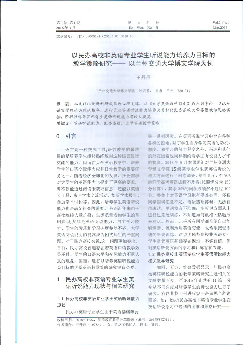 《以民办高校非英语专业学生听说能力培养为目标的教学策略研究》成果展示(2016年6月申报)