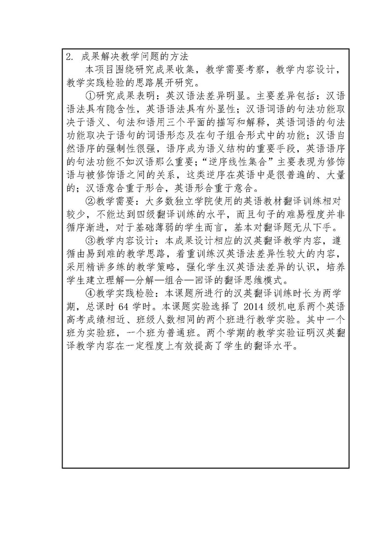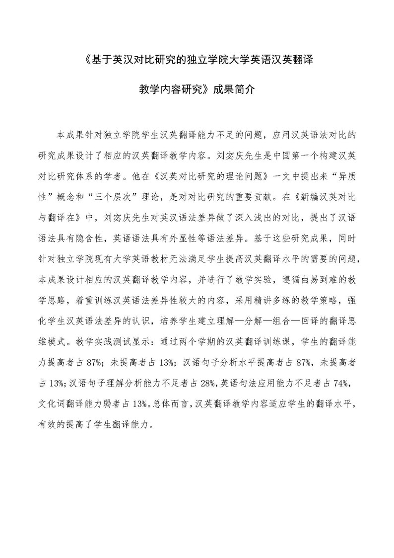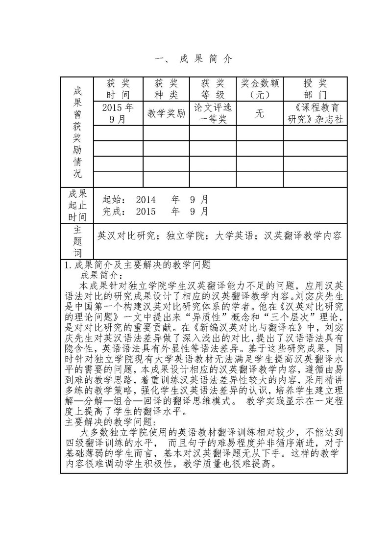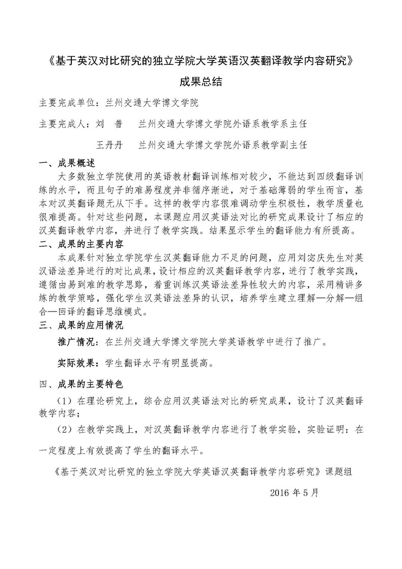 《基于英汉对比研究的独立学院大学英语汉英翻译教学内容研究》成果推荐材料(2016年6月申报)