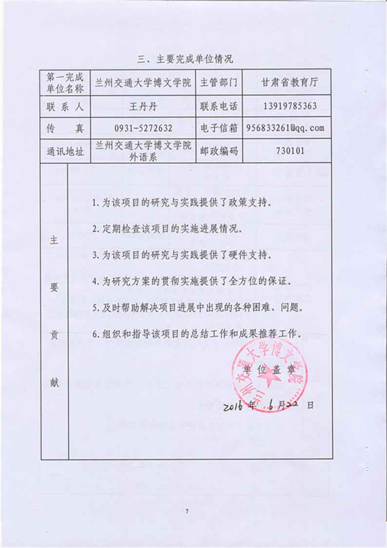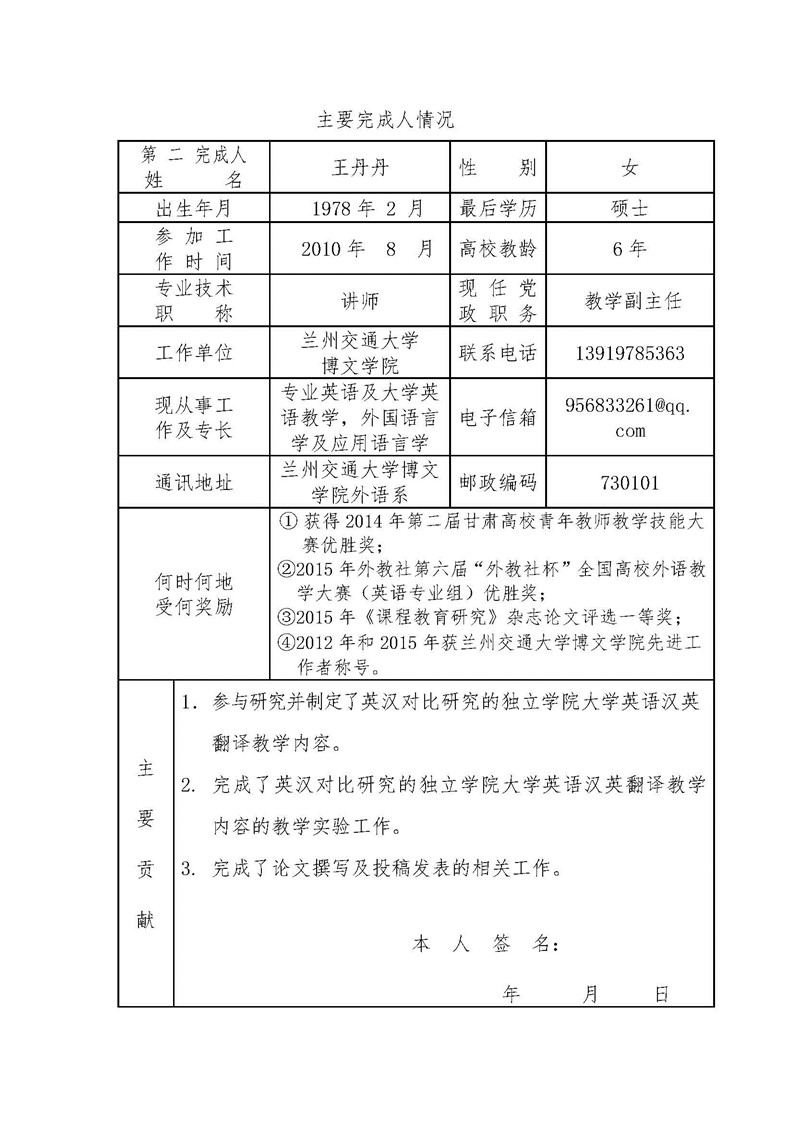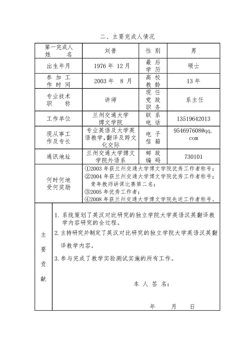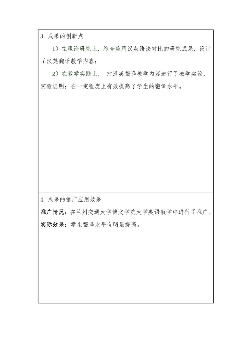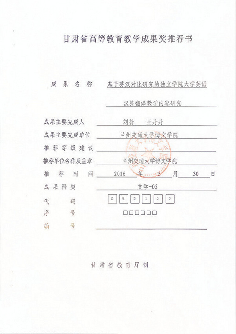 《基于英汉对比研究的独立学院大学英语汉英翻译教学内容研究》成果推荐材料(2016年6月申报)