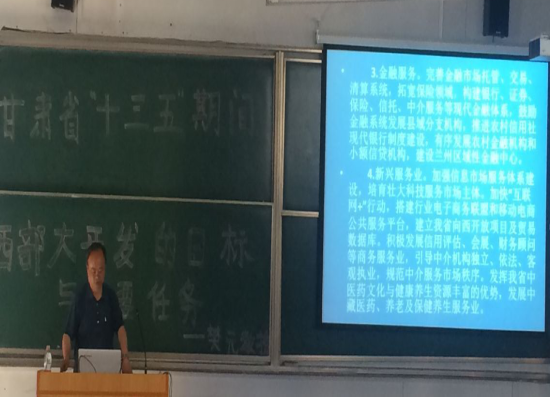 2017年6月20日下午14:30,我院客座教授——西北师范大学樊元教授应邀来我院做题为“甘肃省十三五期间西部大开发的目标与主要任务”学术报告。 首先,樊教授通过整体综合实力迈上新台阶,基础设...