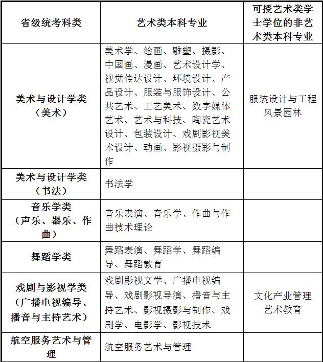 中央戏剧学院、中央美术学院、中央音乐学院、中国音乐学院、北京电影学院、北京舞蹈学院、中国戏曲学院、天津音乐学院、天津美术学院、鲁迅美术学院、沈阳音乐学院、吉林艺术学院、上海音乐学院、上海戏剧学院、南京艺术学院、中国美术学院、景德镇陶瓷大学(原景德镇陶瓷学院)、山东艺术学院、山东工艺美术学院、武汉音乐学院、广州美术学院、星海音乐学院、广西艺术学院、四川美术学院、四川音乐学院、云南艺术学院、西安美术学院、西安音乐学院、新疆艺术学院等29所高校的艺术类本科专业。