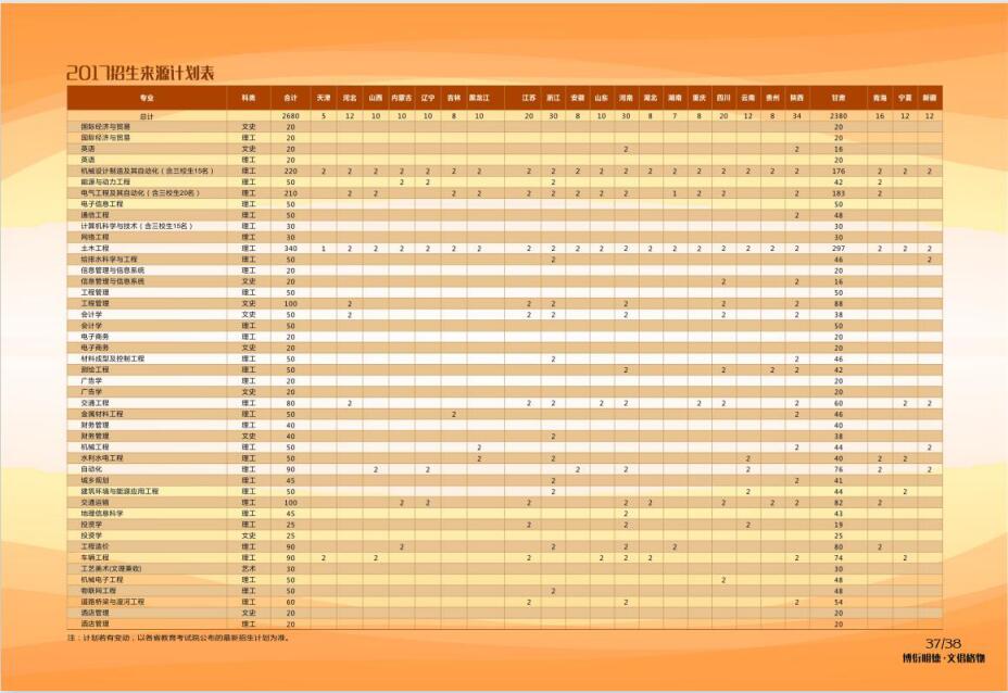 2017年我院面向全国23个省(市、区)招收本科生共2680名,面向甘肃招收本科生2380名。其中艺术类专业计划30名、三职生计划50名、南疆单例计划1名。