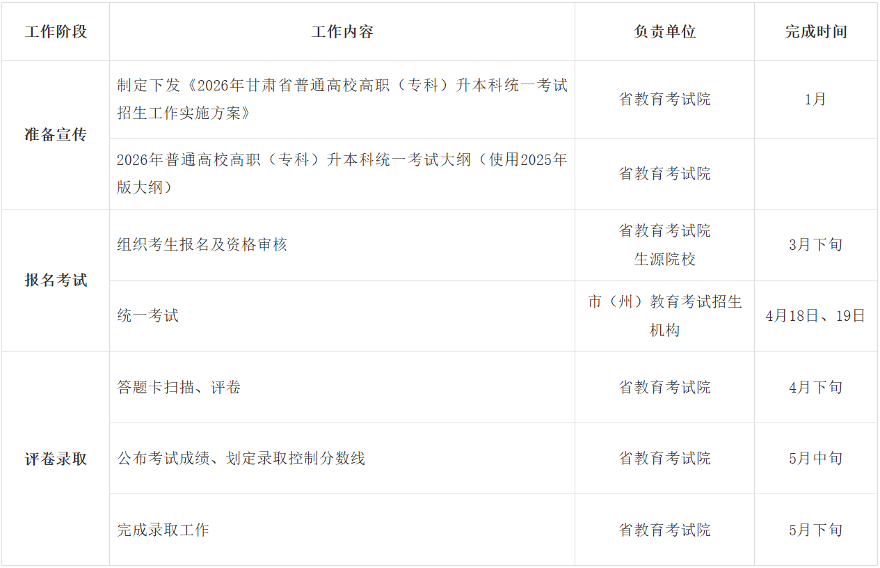 2026年甘肃省普通高校高职(专科)升本科统一考试招生工作进程表