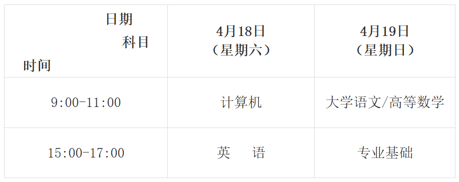 (四)考试时间。全省统一考试时间为4月18日、19日。具体考试时间与考试科目安排如下(北京时间):
