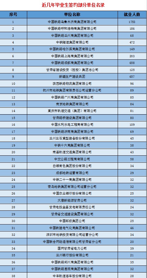 学院高度重视毕业生就业工作,努力为毕业生搭建就业平台,与众多大型国有企业建立了长期校企合作关系,同时,被几十家企业确立为人才培养基地,并在校外建有80多家实习实训基地。毕业生主要面向各大铁路局、中国中铁、中国铁建、各地城市轨道交通、各大工程局、水利水电局、新疆兵团等大型国有企业就业。学院近几年毕业生就业率都稳定在95%以上,所培养的毕业生受到社会的高度认可,针对专升本学生毕业优先推荐就业单位。
