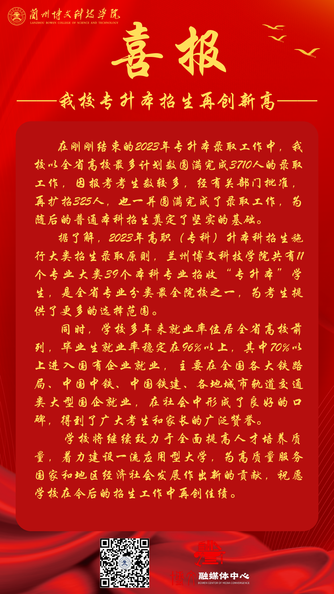 据了解,此次招生工作,我校以全省高校最多计划数招录专升本新生4035人。在招生工作前期,我校相关人员前往省内各高职院校进行专升本招生宣传工作,得到了各兄弟院校的大力支持。学校一志愿填报率较高,在计划录取3710人的基础上,再扩招325人,最终录取专升本新生4035人。